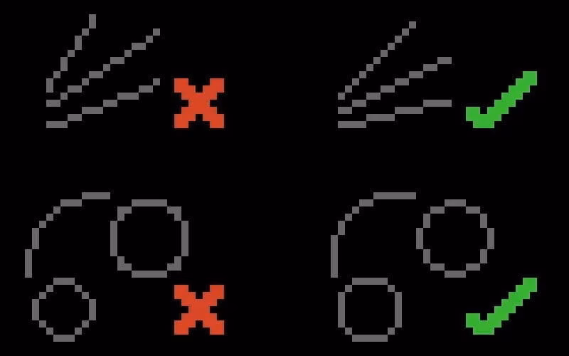「锯齿」是像素画中由于线条/边缘未经润色、或缺少抗锯齿而出现的形状 (无意中产生的边角),直线的步长需要保持一致,这样看起来就不会过于粗糙。