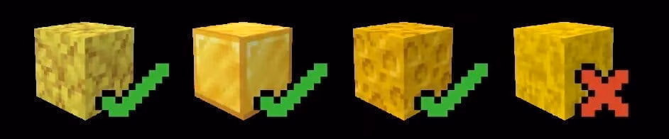 对方块纹理的要求不同于物品,方块纹理既需要考虑其单独出现,也需要考虑相邻放置的情况。将多个同类方块紧贴放置的行为称作「平铺」,如果在视觉上能感到纹理中有部分显著重复、凸显出平铺的图案,这种情况就需要加以纠正了。